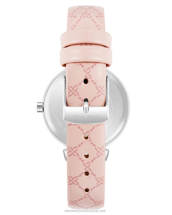 lichtroze getextureerde wijzerplaat met zilverkleurige wijzers en markeringen; witte buitenminutentrack